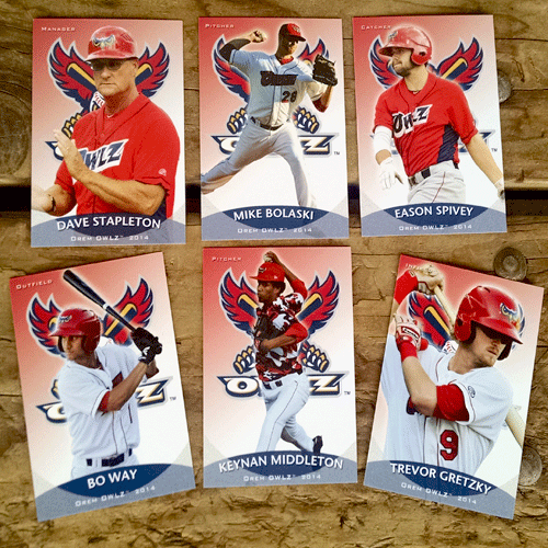 2014 Orem Owlz team card set featuring roster players like Bo Way, Trevor Gretzky, Ryan Seiz, Wade Wass, and more.